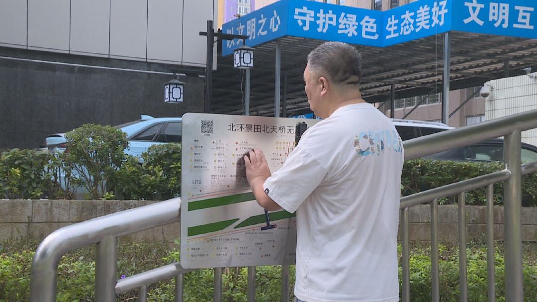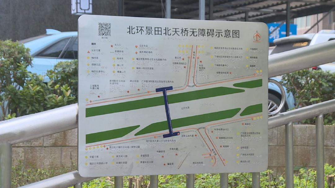 记者在北环景田北天桥看到,人行天桥的4个出入口,都安装了明盲对照无障碍示意图和扶手铭牌,视障人士通过这些设施,能够更加方便地辨别自身所处的位置、附近的完整方位信息。