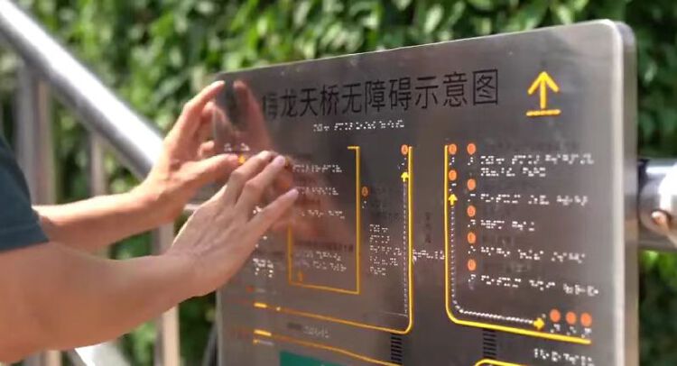 在梅龙天桥上,各个方向的楼梯入口扶手上,均安装有盲文对照的天桥信息示意图,可供视障者获取天桥附近的完整方位信息,帮助他们辨别自身所处的位置,还有正确的路径方向。