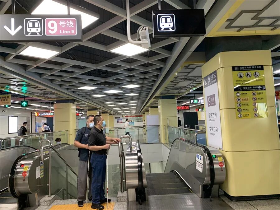 地铁已经成为视障人士出行的首选,市盲协本次重点对地铁站内无障碍出行引导系统进行了考察,模拟了完整的出行过程。在地铁9号线上梅林站,从出入口开始,到地铁站厅、乘车站台以及换乘通道,所有沿盲道行进的不锈钢扶手上,都设置了盲文标识。督导小组在仔细地摸读了每个盲文标识后,发现该站的盲文标识设计非常贴合视障人士的需求,例如在站厅到站台的楼梯扶手处,两侧的盲文标注都有所区别,很贴心地指示了两侧下行到达站台的列车行驶方向,在全国其他地方的盲文标识,他们还未遇到过这种办法。类似的提示设计在该站处处都是,真正实现了视障人士出行的“畅达易行”。